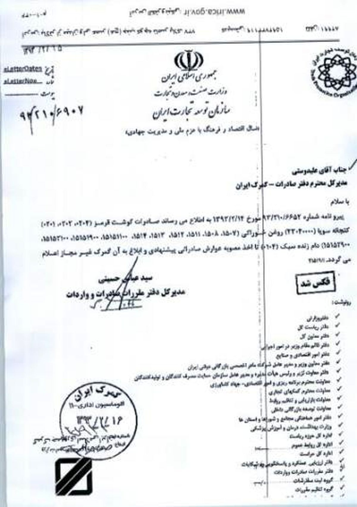 ۱ - صادرات گوشت قرمز(۰۲۰۴،۰۲۰۲، ۰۲۰۱) و کنجاله سویا(۲۳۰۴۰۰۰۰) روغن خوراکی(۱۵۰۷،۱۵۰۸، ۱۵۱۱،۱۵۱۳، ۱۵۱۴،۱۵۱۵۱۱۰۰، ۱۵۱۵۱۹۰۰،۱۵۱۵۲۱۰۰، ۱۵۱۵۲۹۰۰و۱۵۱۲) دام سبک(۰۱۰۴) ممنوع می باشد.