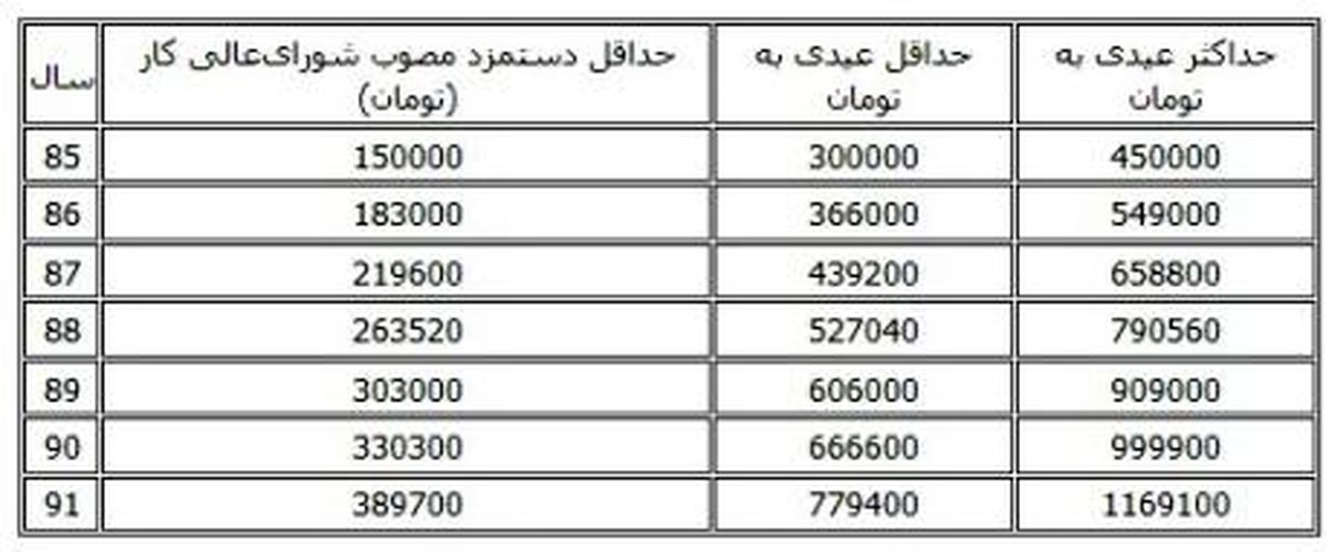 | حداکثر عیدی | حداقل عیدی | حداقل مزد سالیانه | سال |